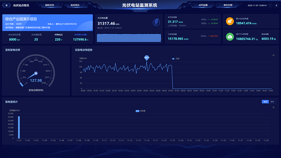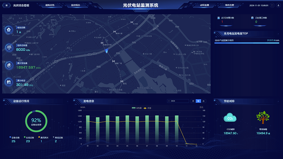 显示光伏站点的发电完成率、设备可利用率、接入站点数量、在线网关数量、总装机容量等数据。