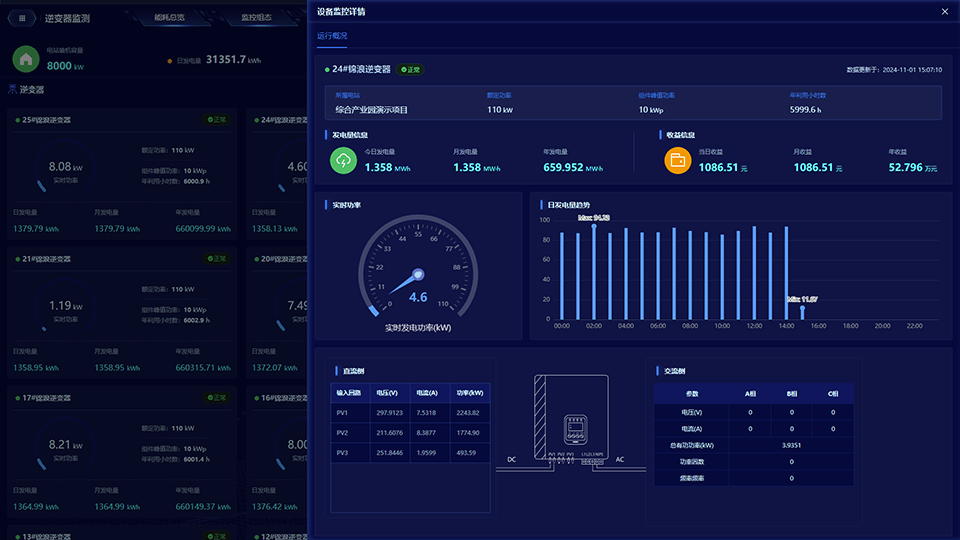 展示光伏站点的发电量、辐照量、co2减排量、装机容量、逆变器数量、功率、环境温湿度、当前风速等站点数据。